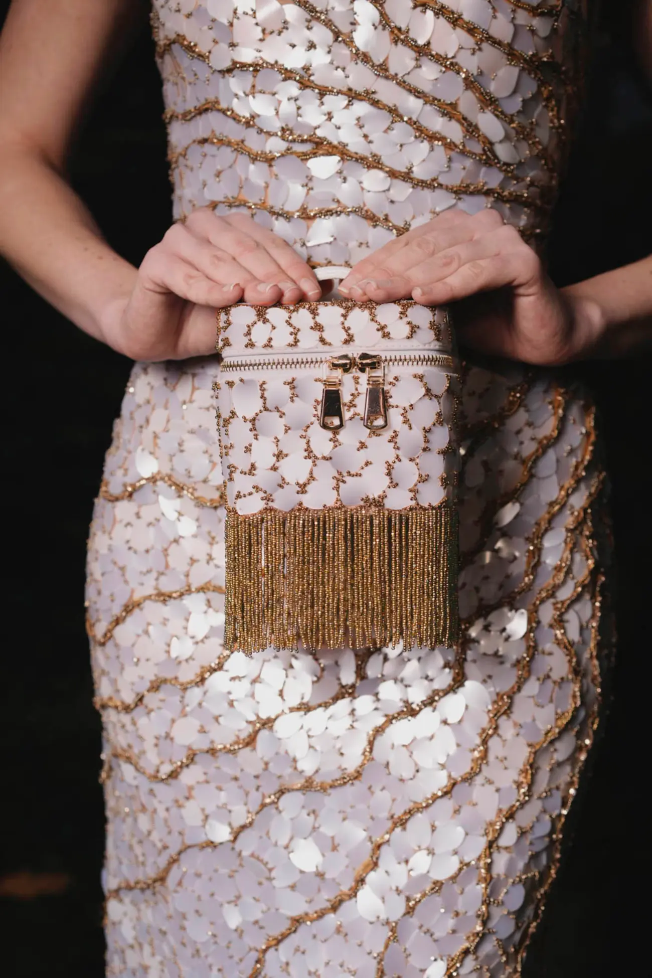 The collection comprises 46 pieces, articulated through elongated and architectural silhouettes that balance structure with fluidity. Sculptural gowns coexist with softer, flowing forms, creating variation in volume and movement across the collection. Variation in embroidery density, material weight, and construction introduces visual rhythm, moving between lighter, more ethereal looks and more grounded, structured pieces. While each look stands independently, together they form a cohesive canvas.