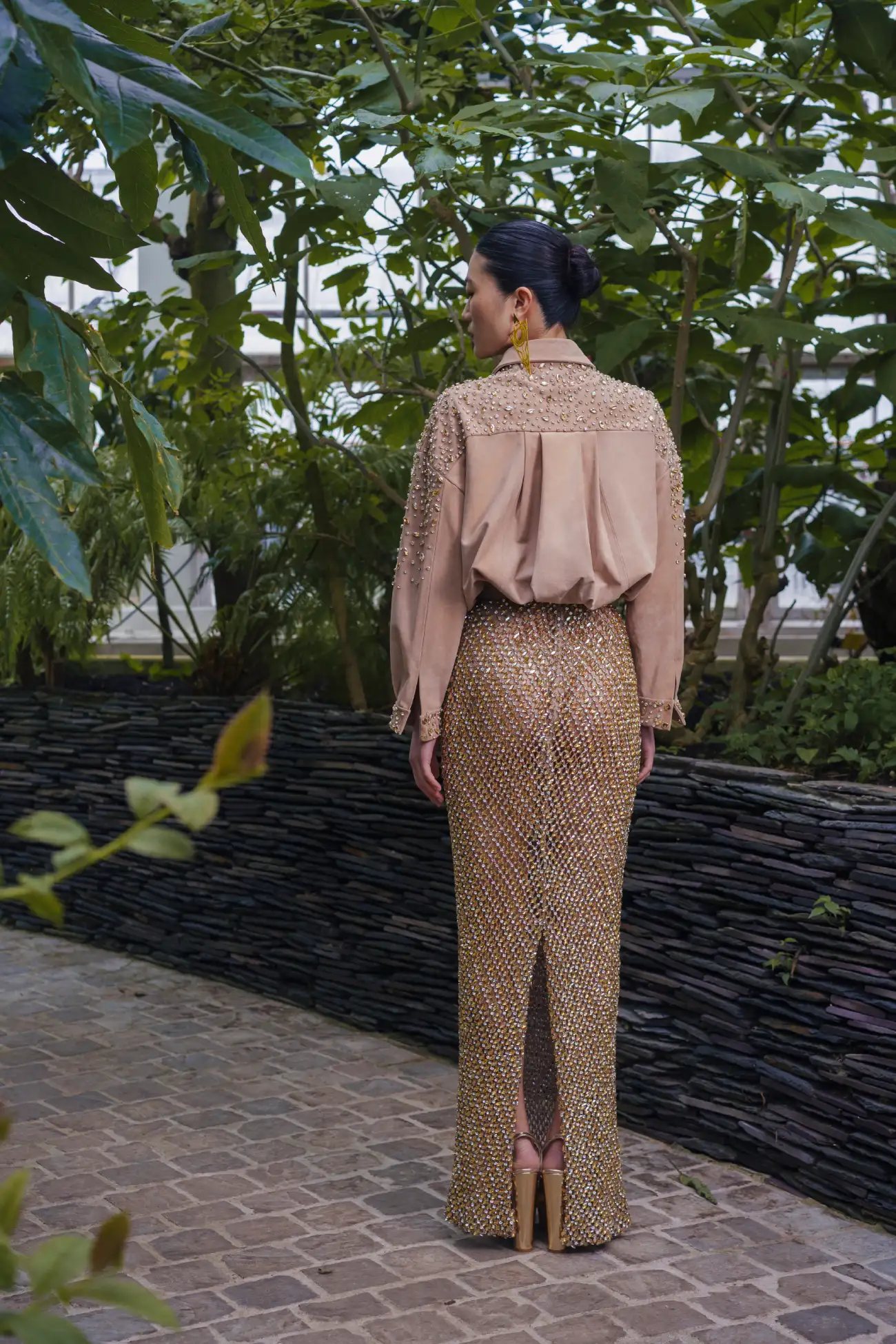 A Gold net skirt fully embellished with crystals, paired with an embroidered suede-finish chemise