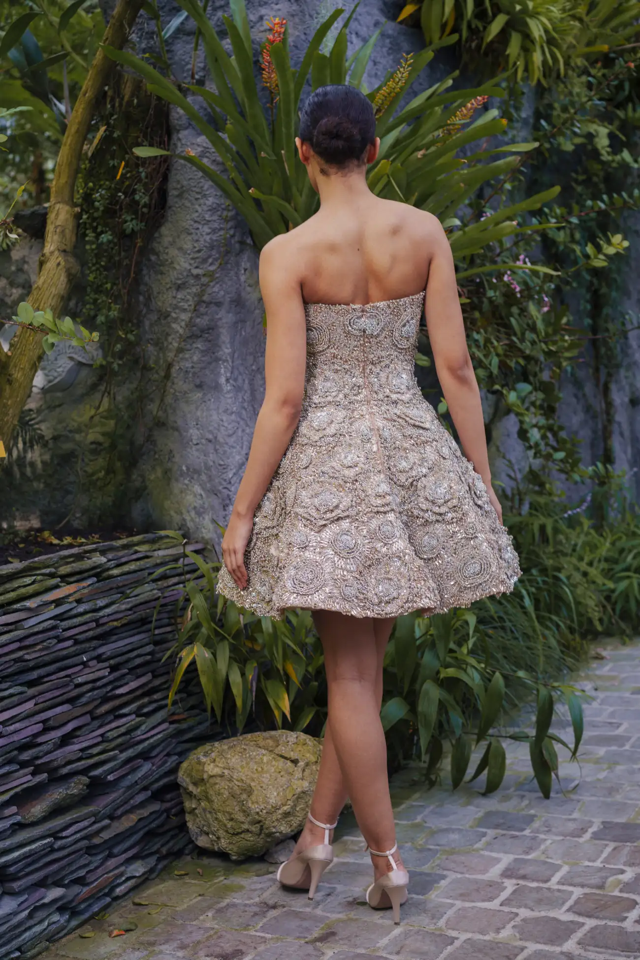 Gold and silver mini dress, fully embellished with three dimensional floral details