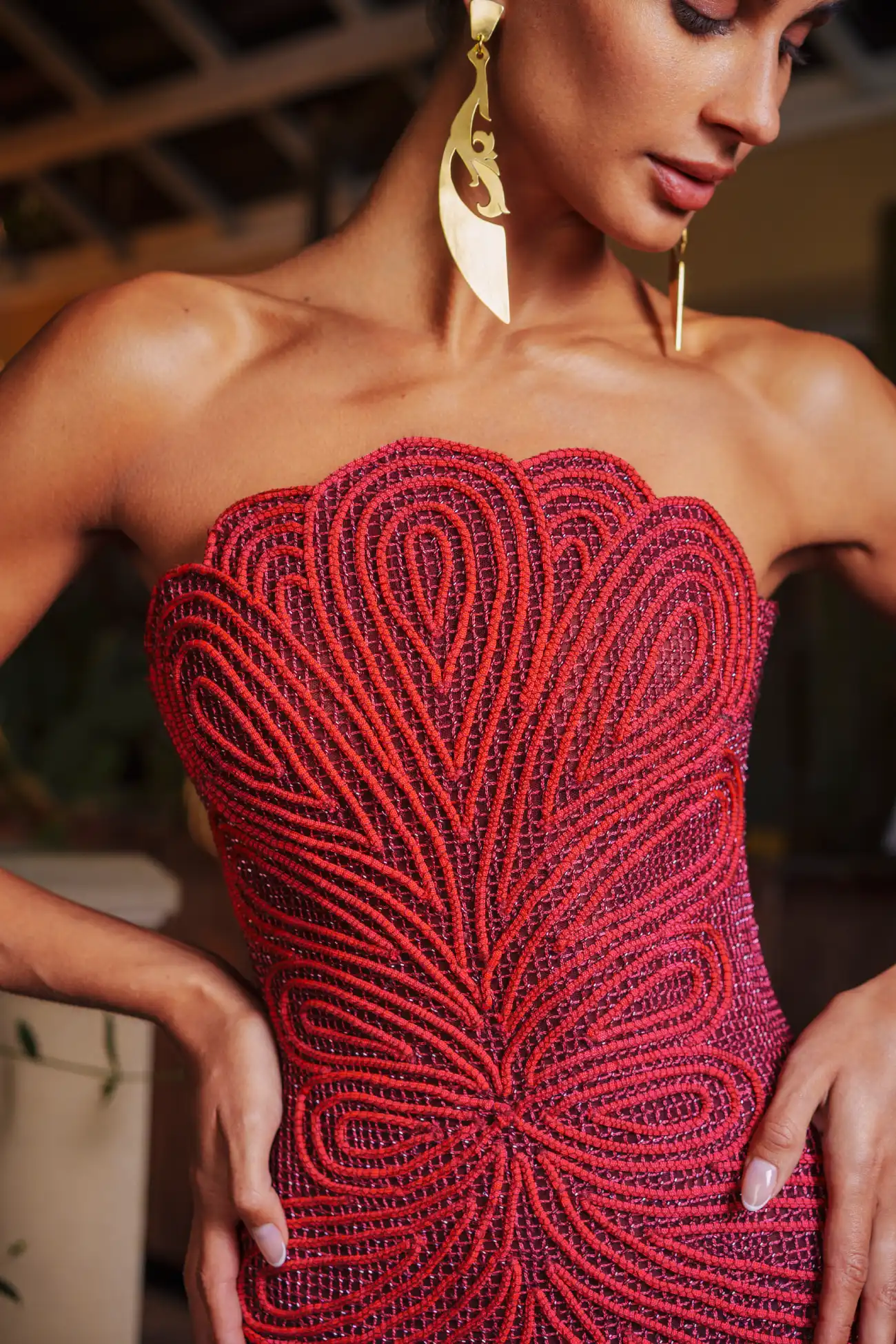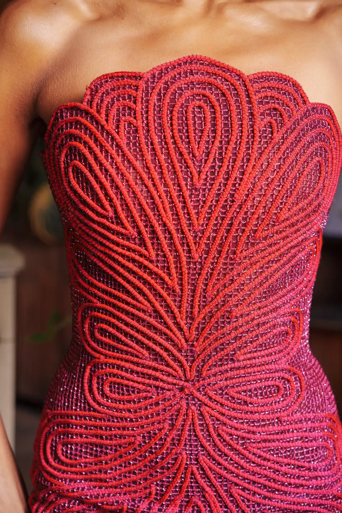 Burgundy corded strapless mermaid gown, accented with rope threads and a scalloped curvilinear pattern
