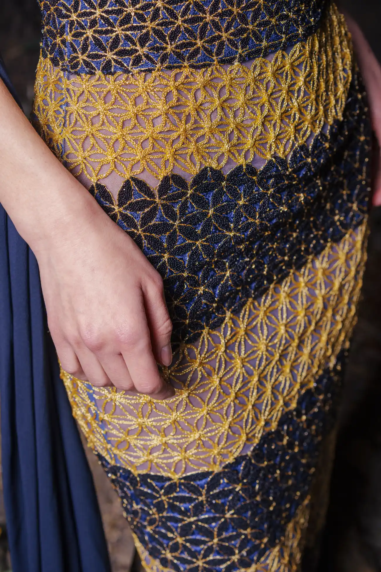 Striped fitted gown, embellished with gold metallic threads detailed with black and dark blue beads