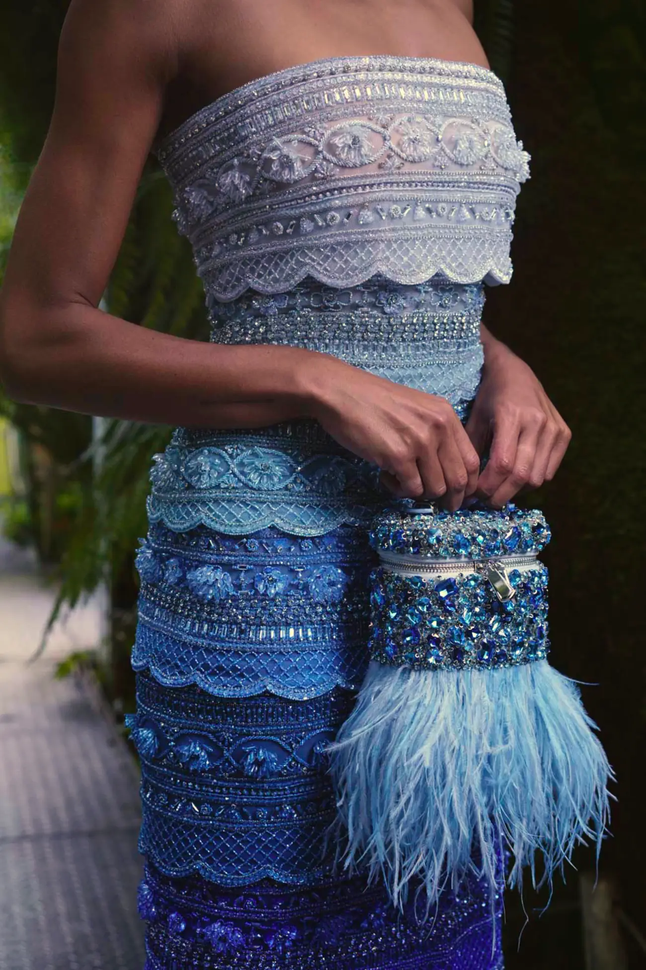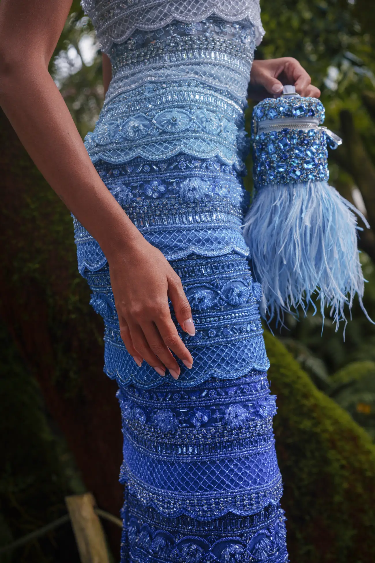 Blue sky to majolica blue ombré ruffled gown, fully embroidered with beads, sequins and crystals