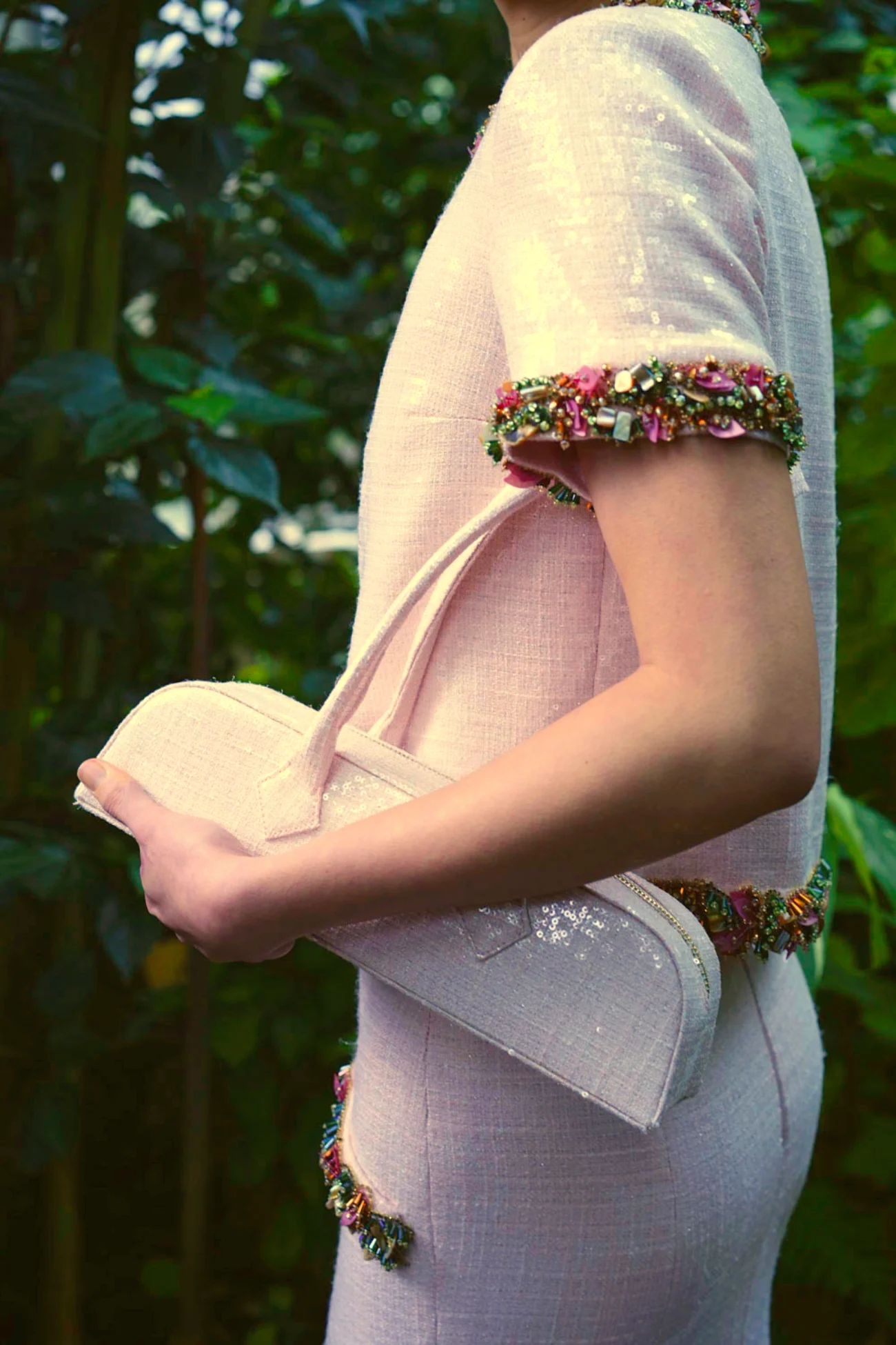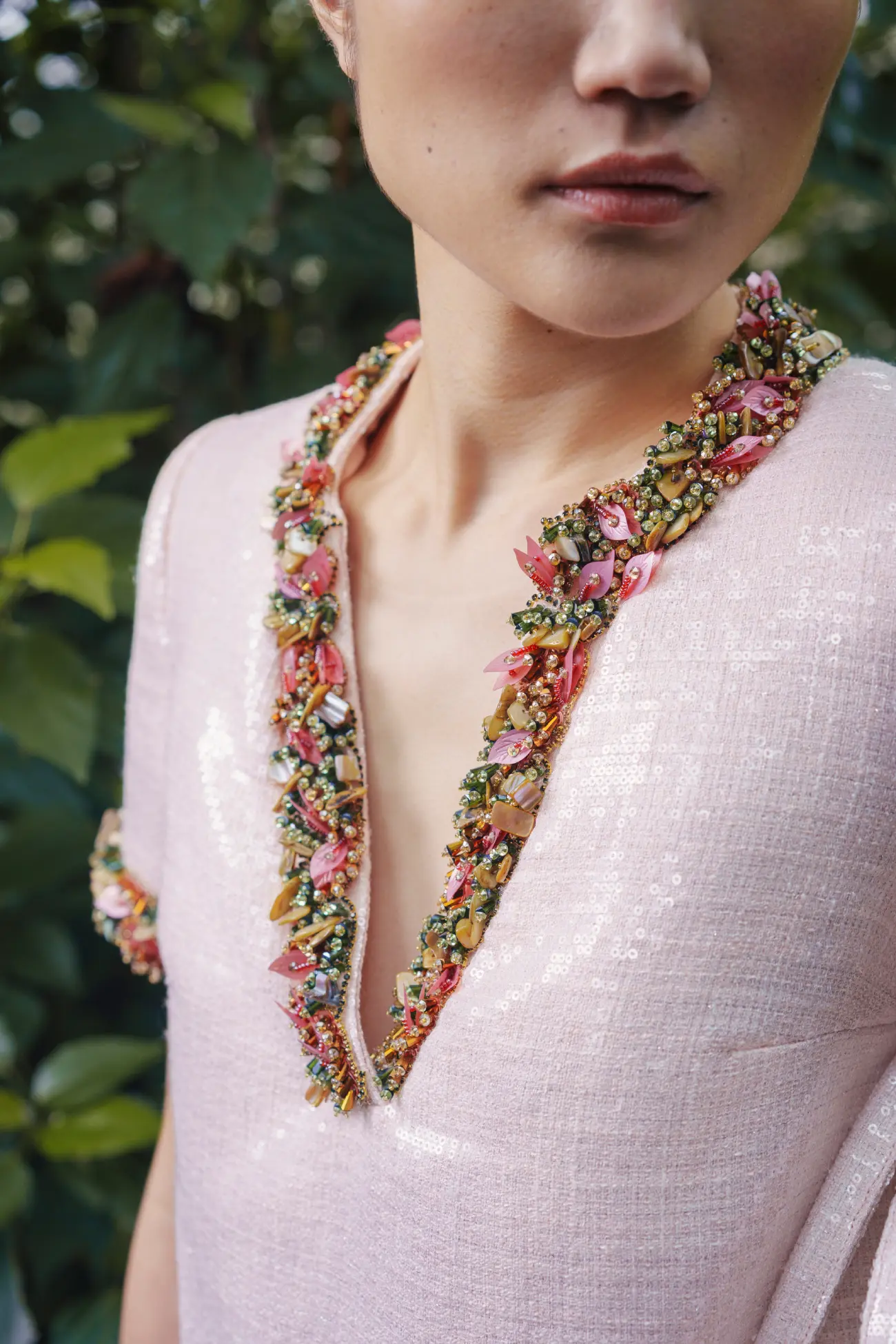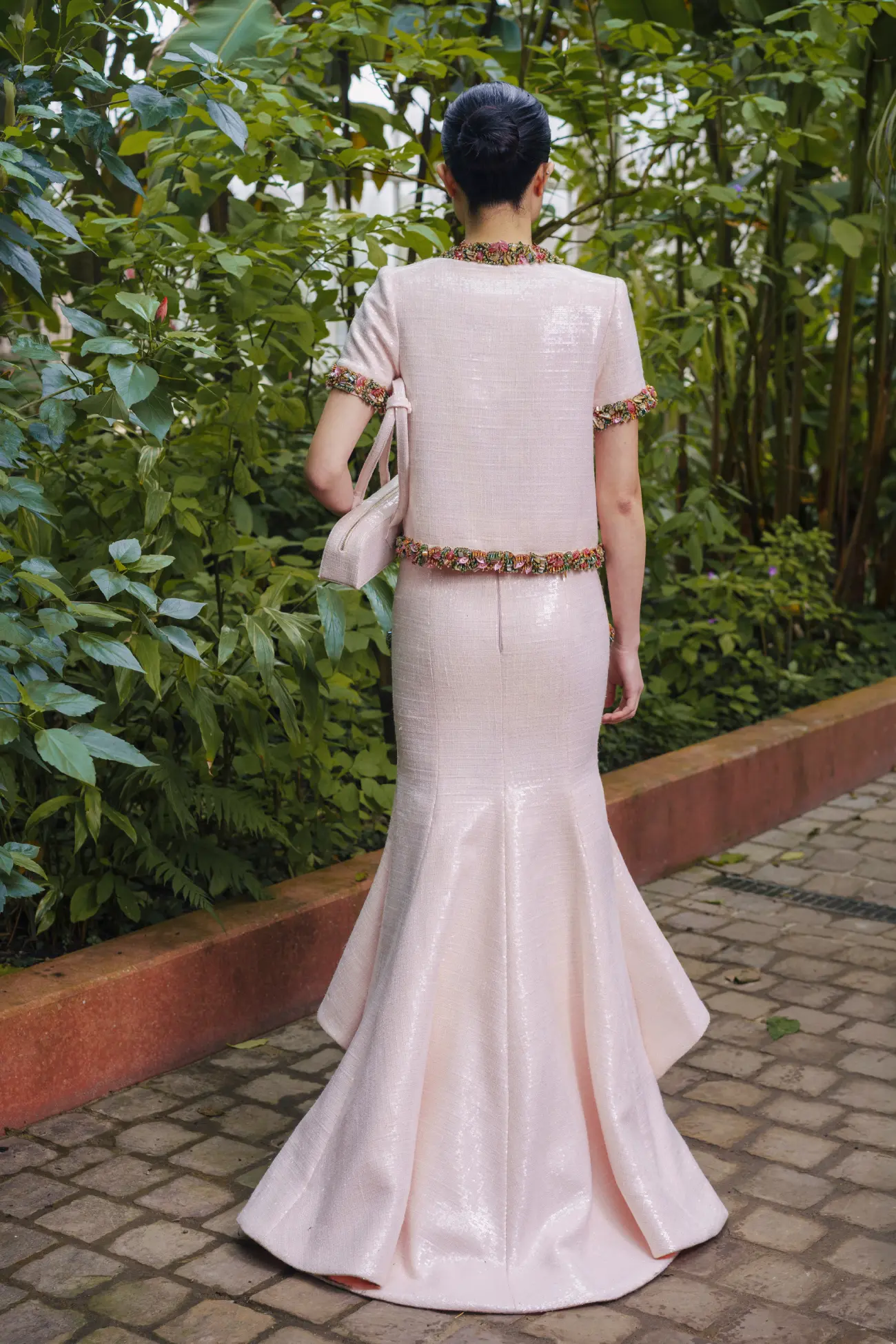Pink Lady two-piece tweed gown, delicately embellished with iridescent sequins and multicolored crystal stones