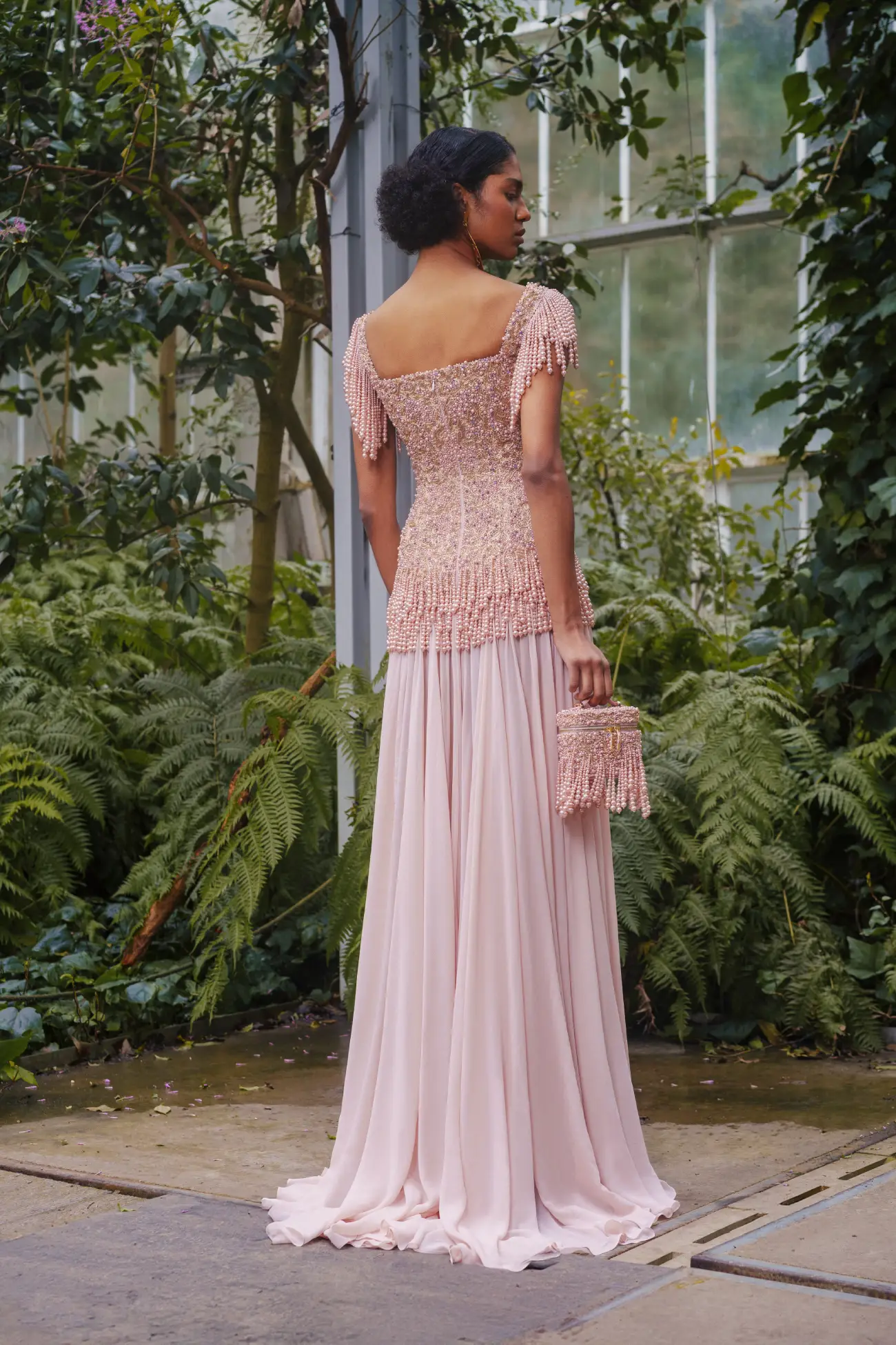 Seashell pink corset with pearl fringe detailing at the waist and shoulders, paired with a muslin skirt