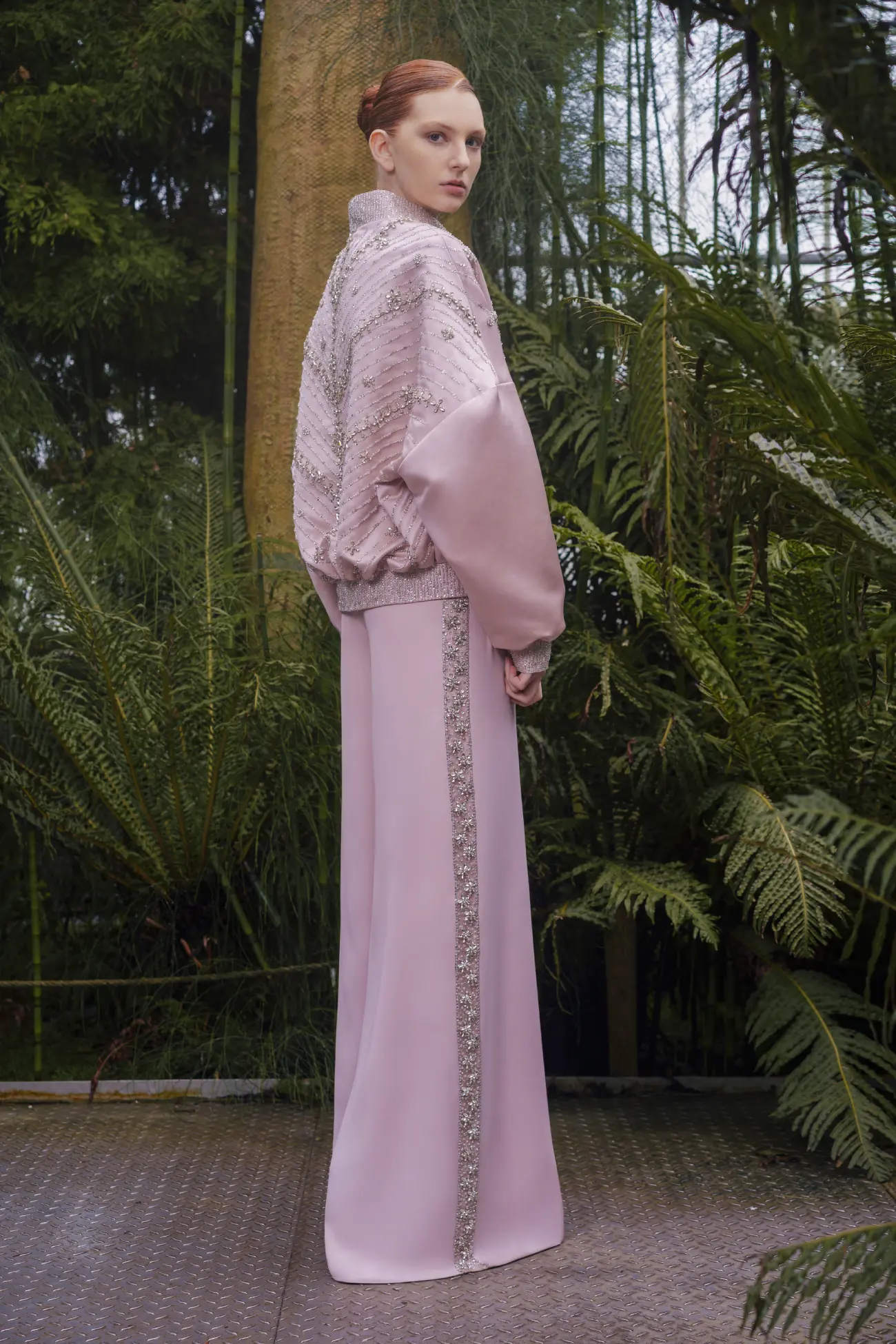 Orchid pink bomber satin jacket embellished with delicate crystal detailing along the borders, paired with crepe wide leg pants featuring side border detailing