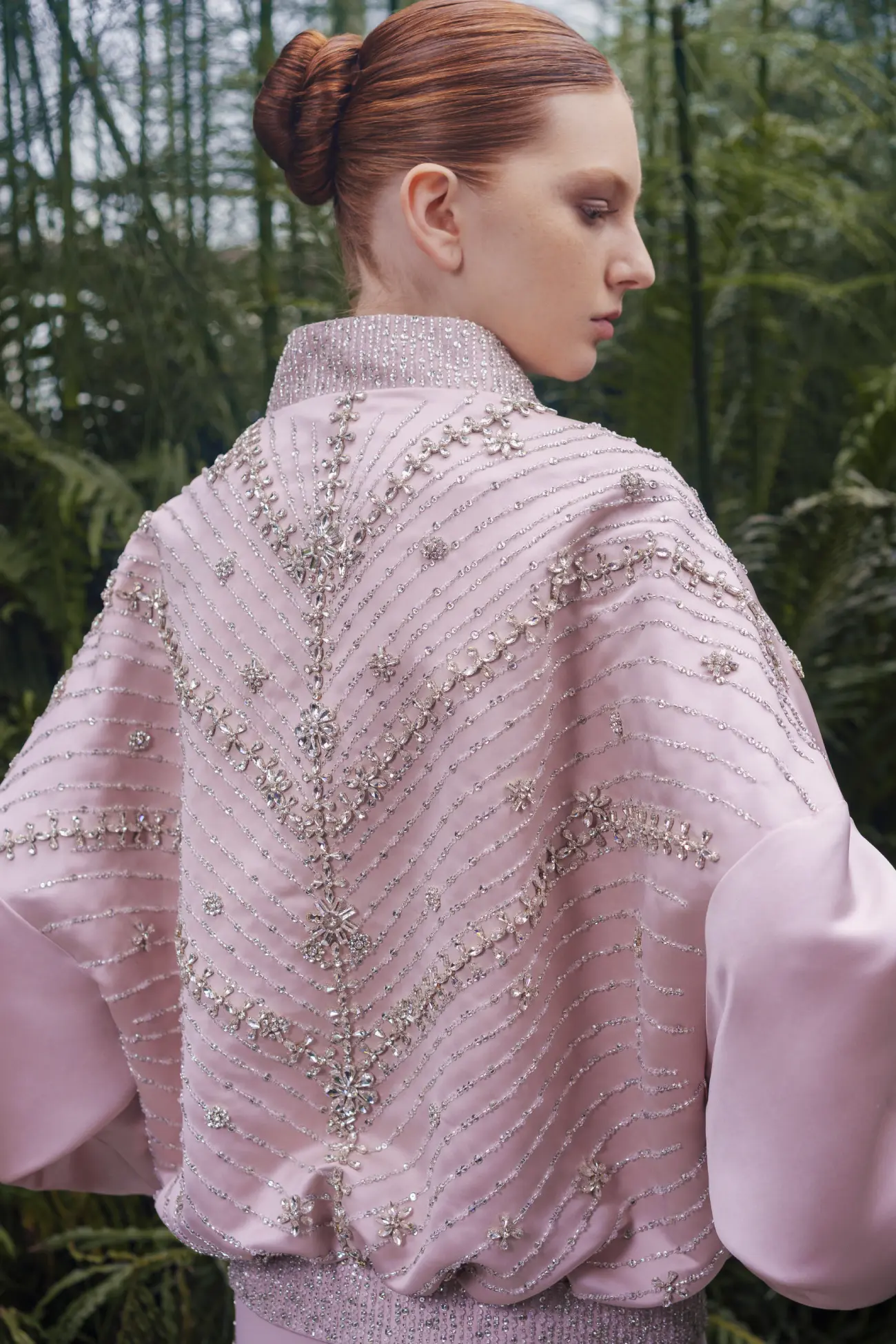 The collection comprises 46 pieces, articulated through elongated and architectural silhouettes that balance structure with fluidity. Sculptural gowns coexist with softer, flowing forms, creating variation in volume and movement across the collection. Variation in embroidery density, material weight, and construction introduces visual rhythm, moving between lighter, more ethereal looks and more grounded, structured pieces. While each look stands independently, together they form a cohesive canvas.
