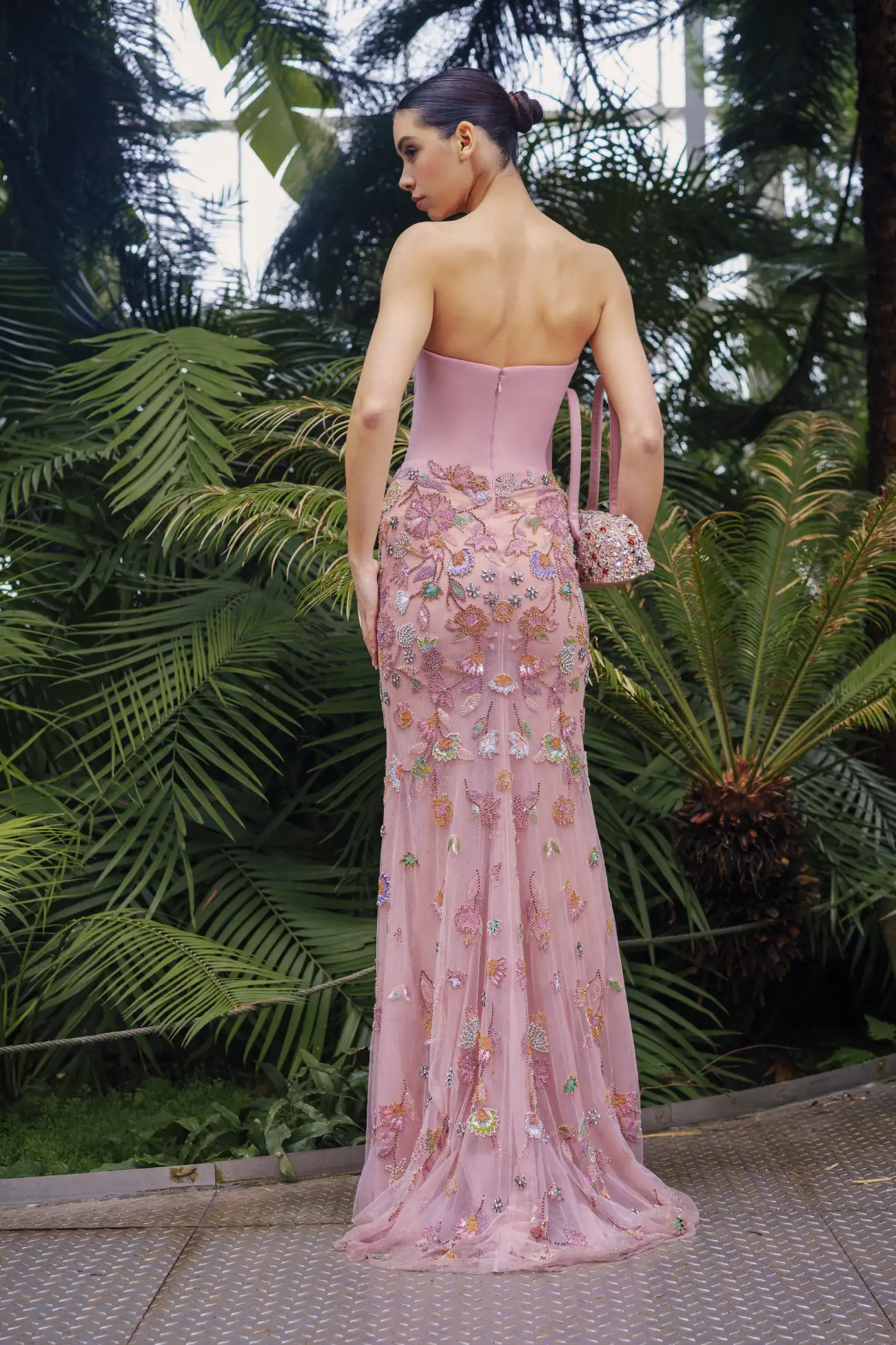Silver pink strapless crepe gown, embroidered with colorful floral crystals motifs, sequins and beads