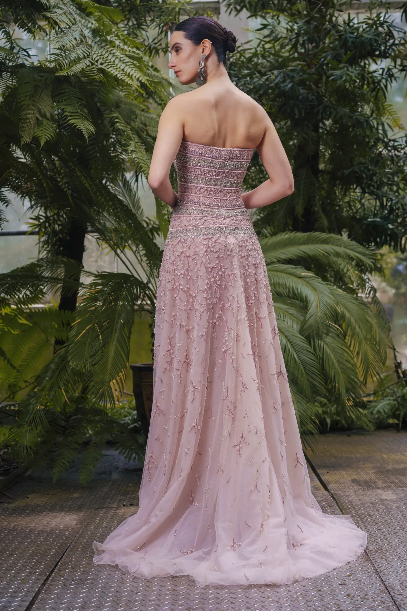 The collection comprises 46 pieces, articulated through elongated and architectural silhouettes that balance structure with fluidity. Sculptural gowns coexist with softer, flowing forms, creating variation in volume and movement across the collection. Variation in embroidery density, material weight, and construction introduces visual rhythm, moving between lighter, more ethereal looks and more grounded, structured pieces. While each look stands independently, together they form a cohesive canvas.