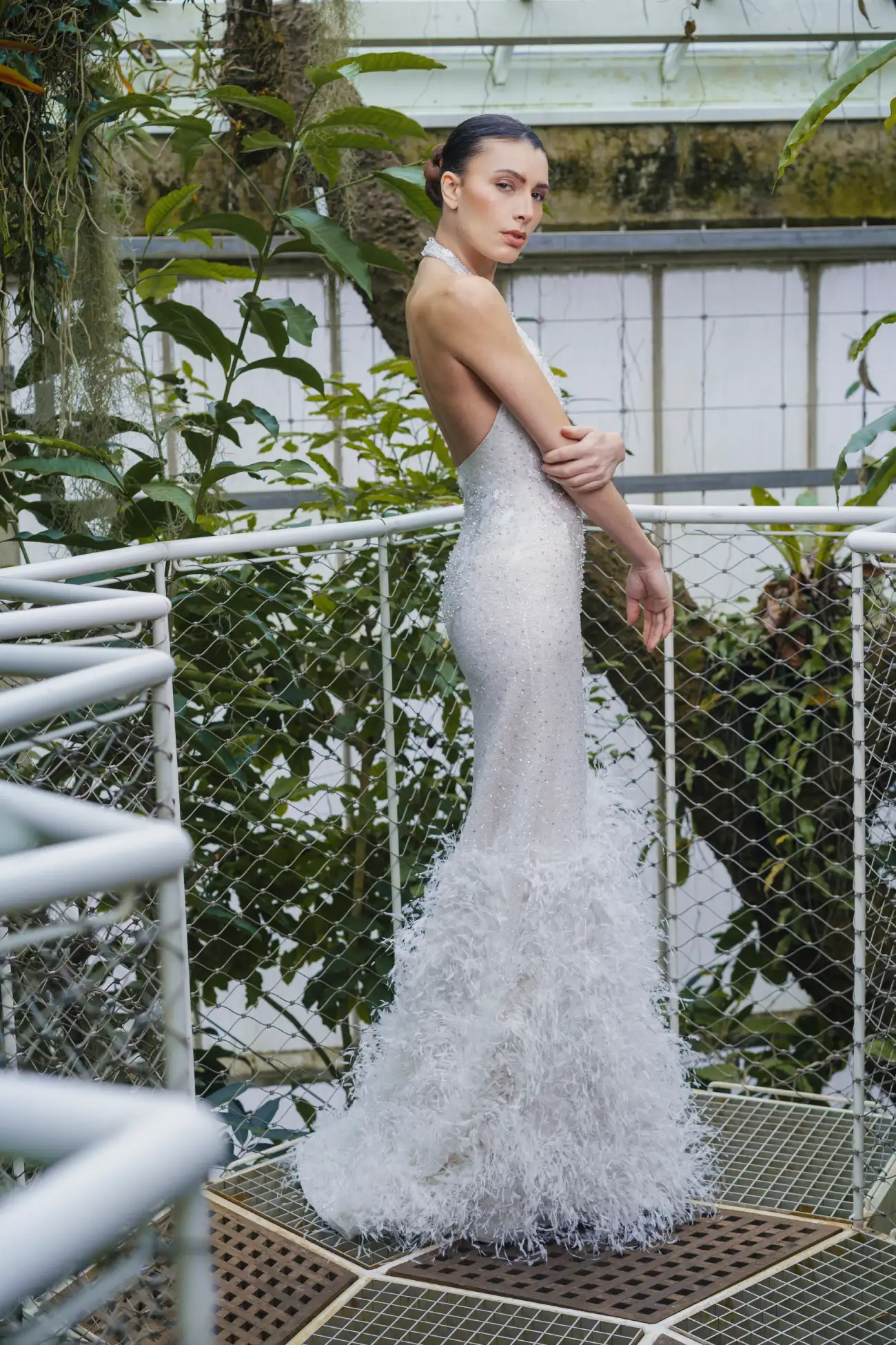 Light sky halter neck gown, embroidered with pearls and sequins, featuring feather accents and a mermaid cut skirt