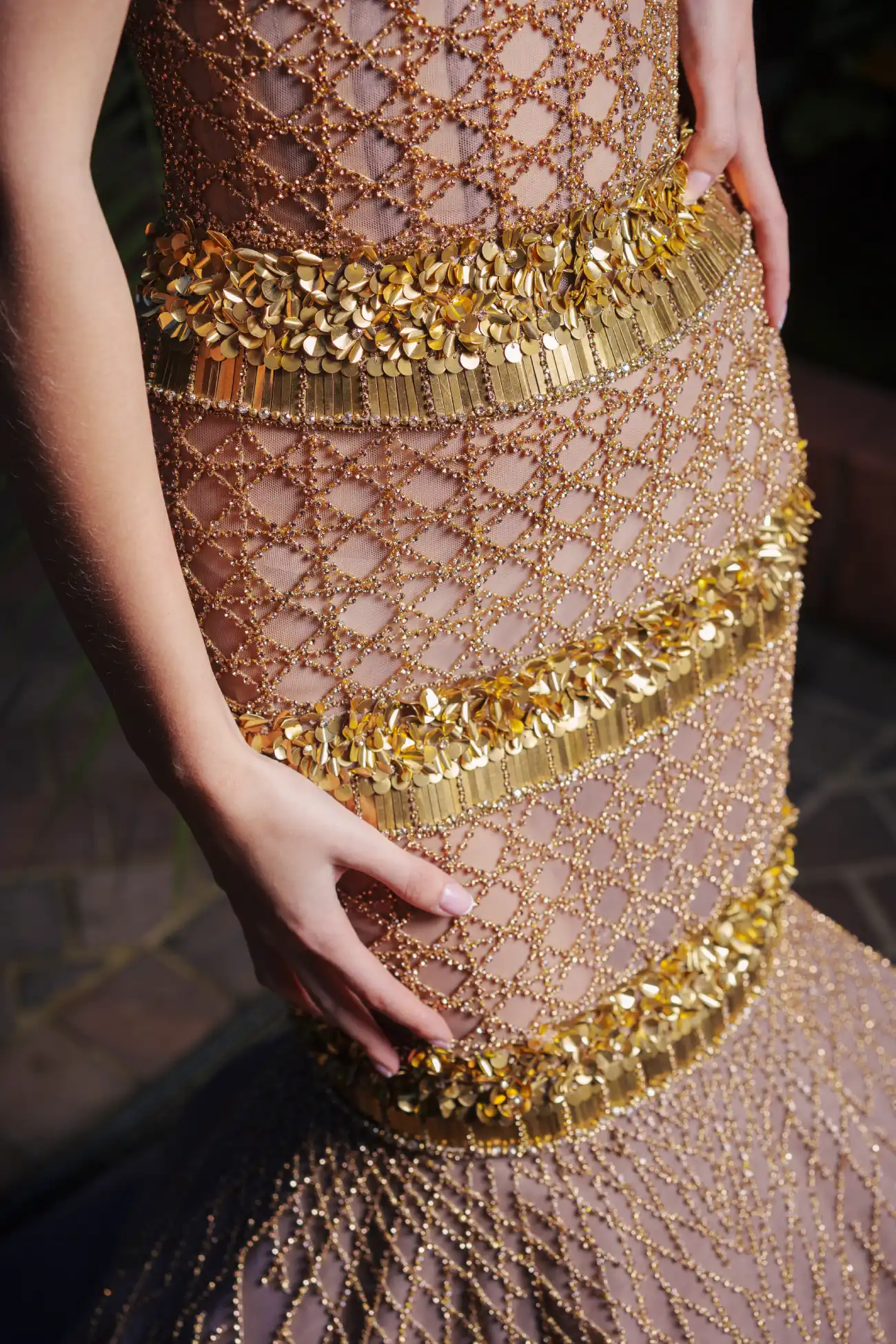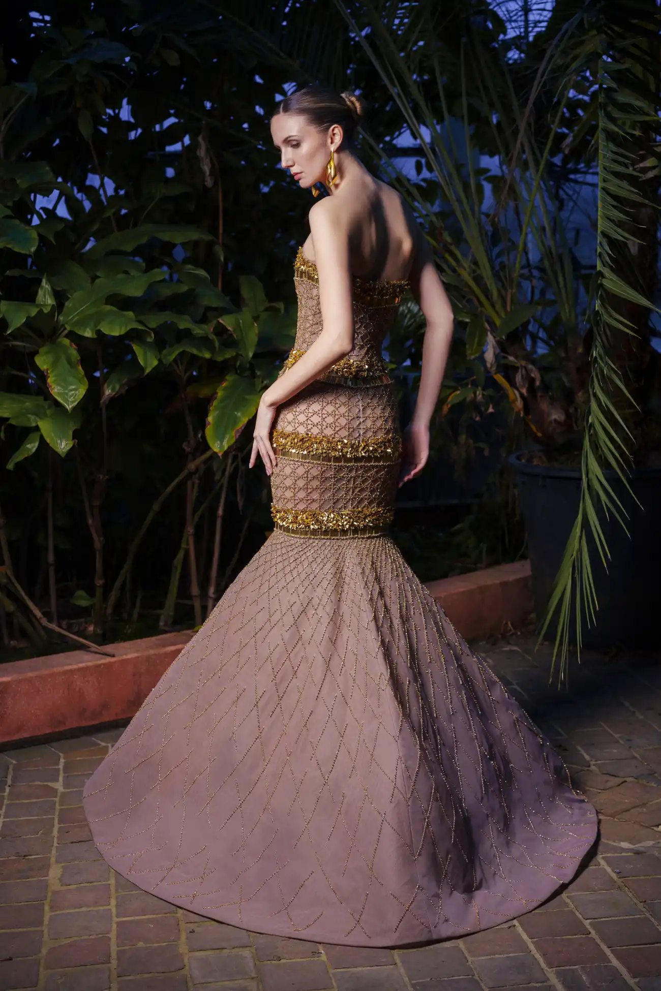 Gold strapless mermaid gown, enhanced with a grid of crystals and sequin panels, finished with delicate floral embellishments