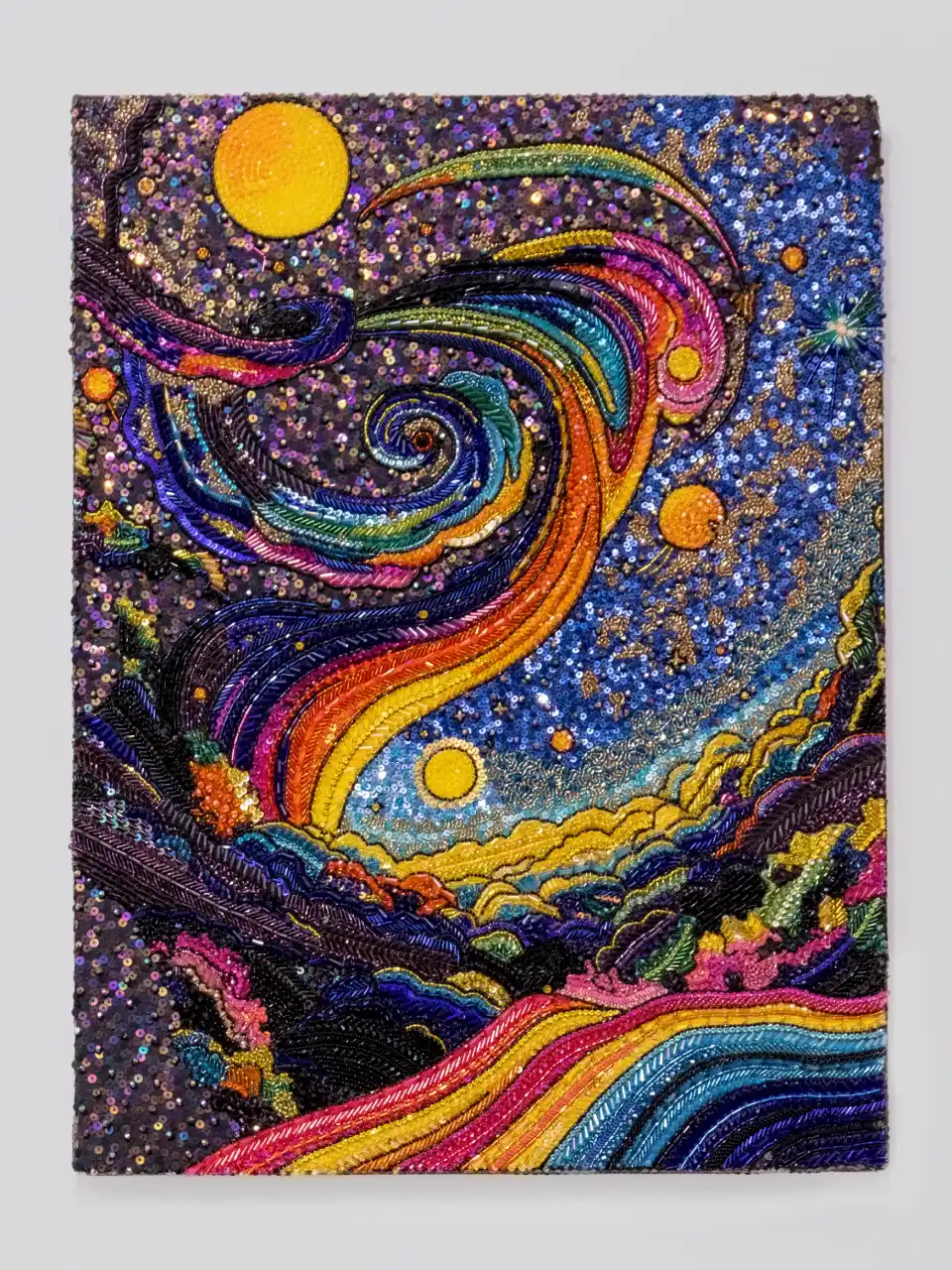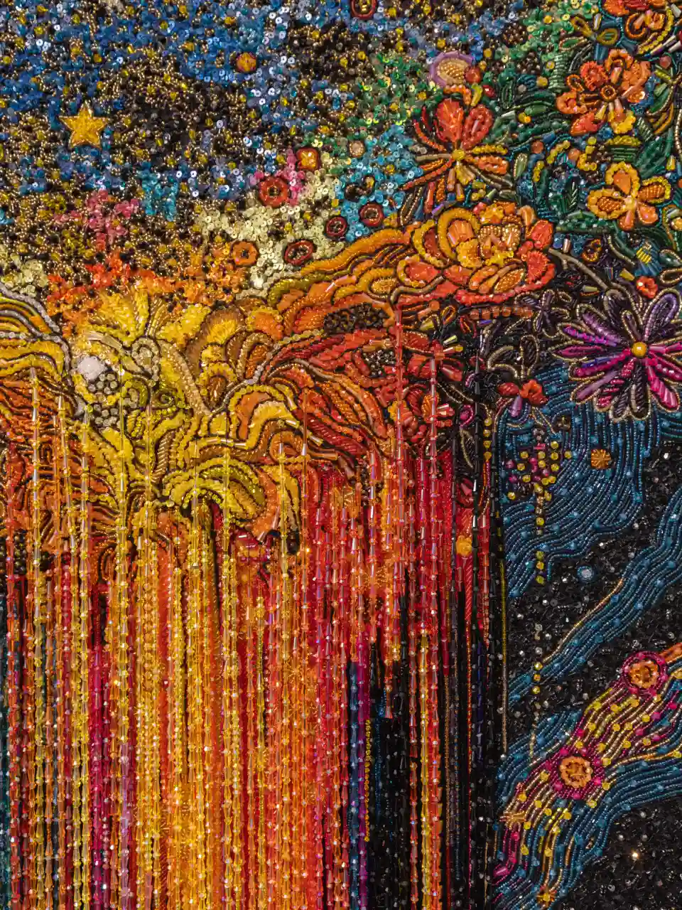 Other notable works include Cosmic Waterfall, where cascading glass beads flow from the canvas onto the floor, blurring the line between artwork and space, and Chromium, a nine-panel constellation of shifting chromatic fields.