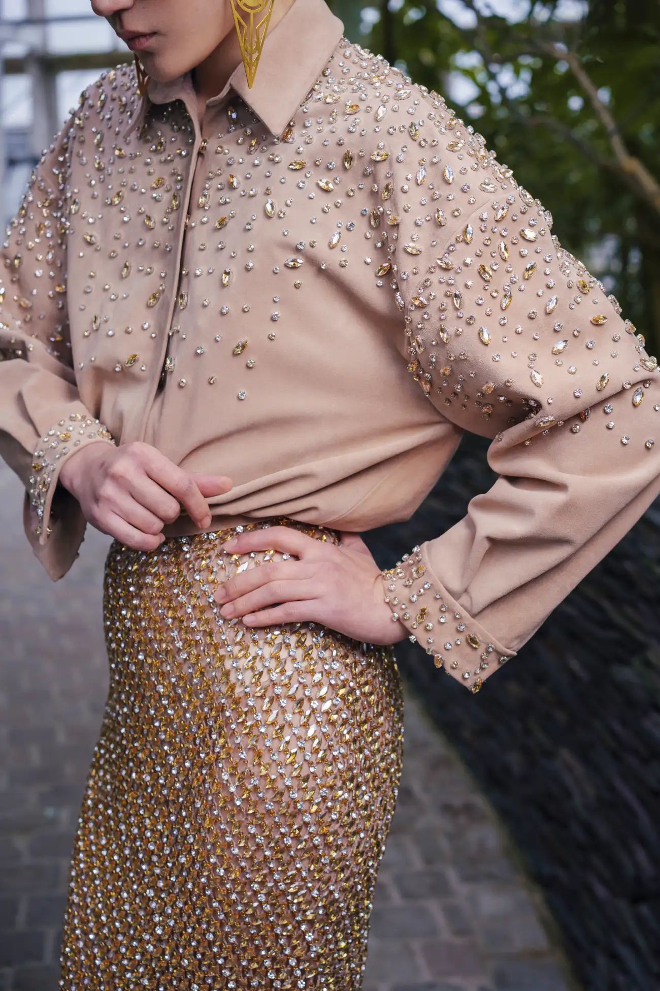 A Gold net skirt fully embellished with crystals, paired with an embroidered suede-finish chemise