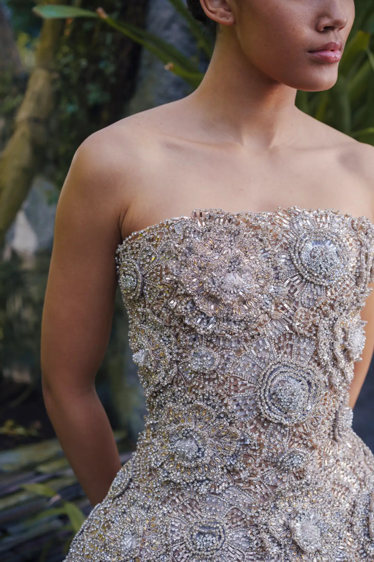 The collection comprises 46 pieces, articulated through elongated and architectural silhouettes that balance structure with fluidity. Sculptural gowns coexist with softer, flowing forms, creating variation in volume and movement across the collection. Variation in embroidery density, material weight, and construction introduces visual rhythm, moving between lighter, more ethereal looks and more grounded, structured pieces. While each look stands independently, together they form a cohesive canvas.