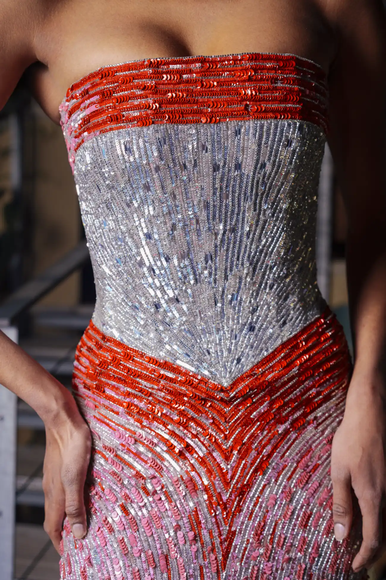 Silver strapless gown accented with pink and red tones, fully embroidered with all over sequins