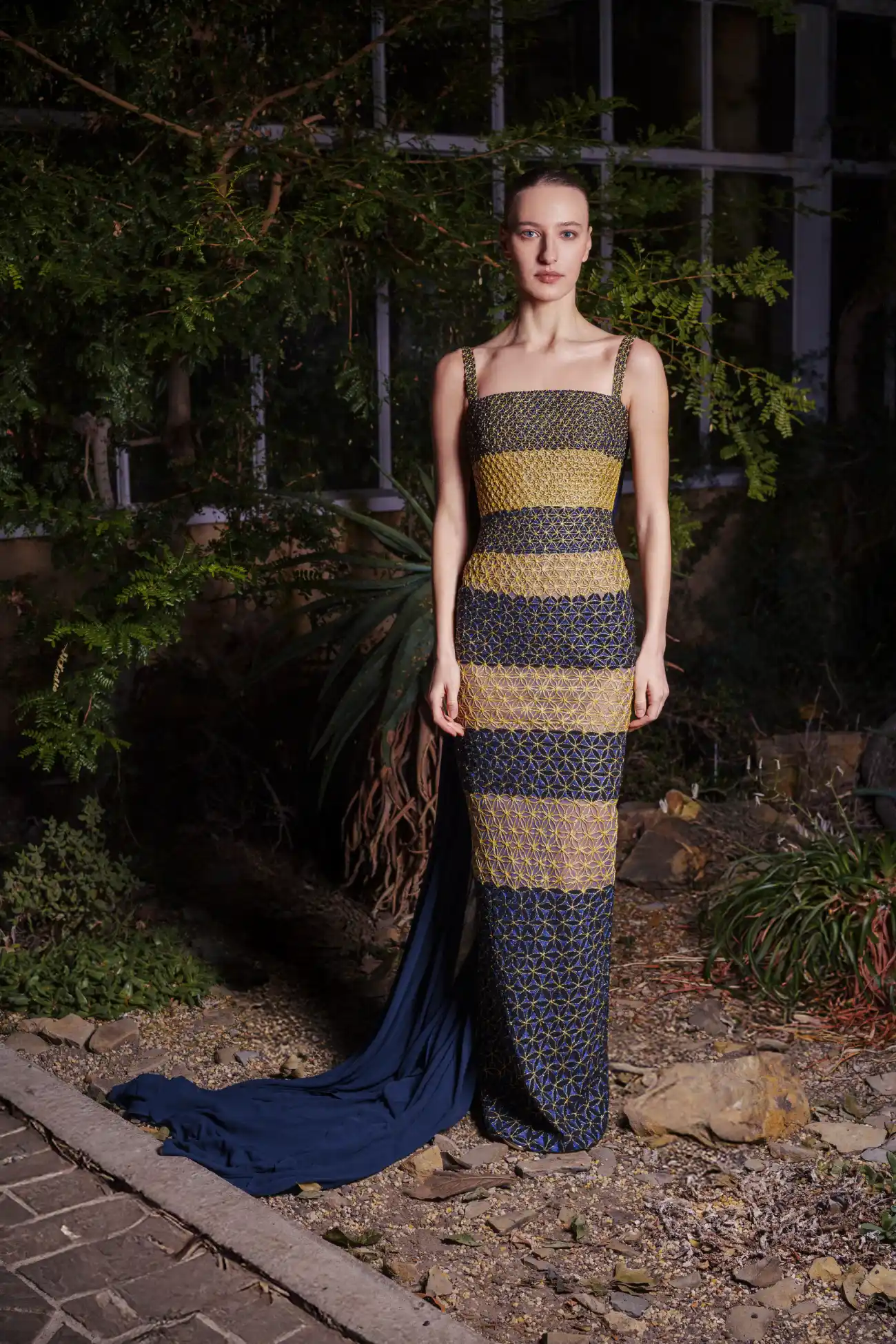 Striped fitted gown, embellished with gold metallic threads detailed with black and dark blue beads