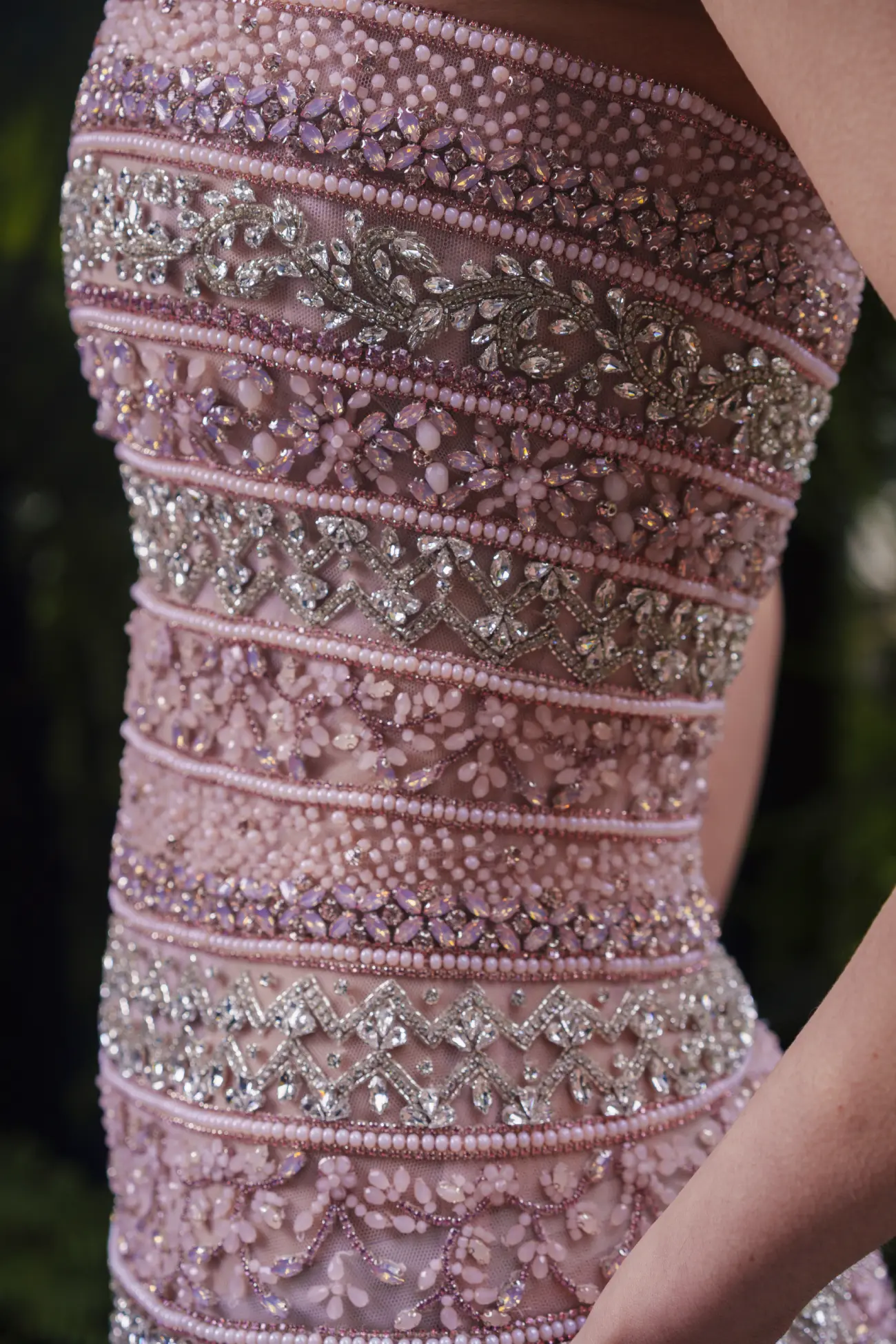 Seashell pink strapless corset embellished with pearl fringes, paired with a flowing muslin skirt