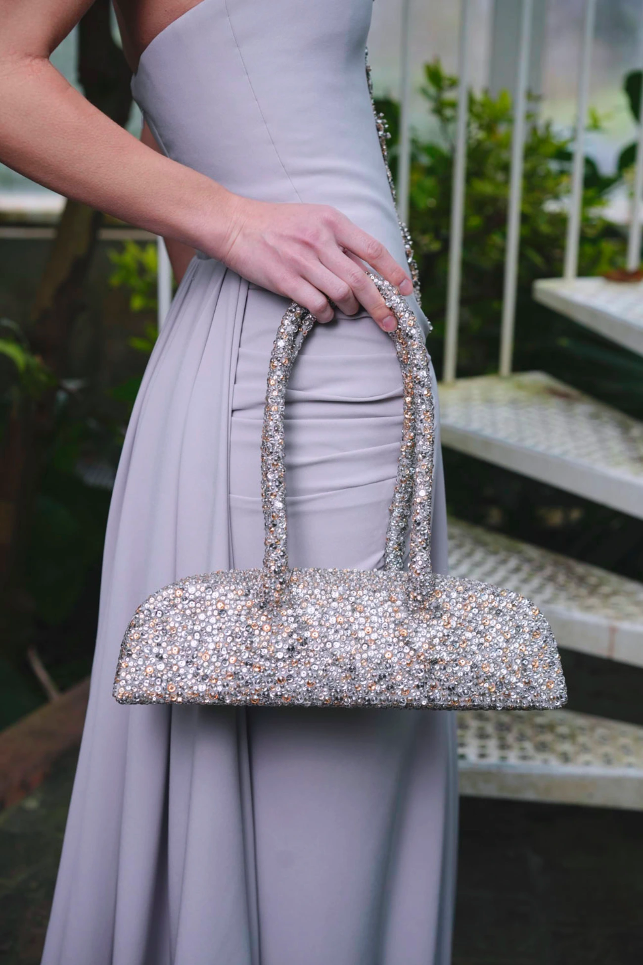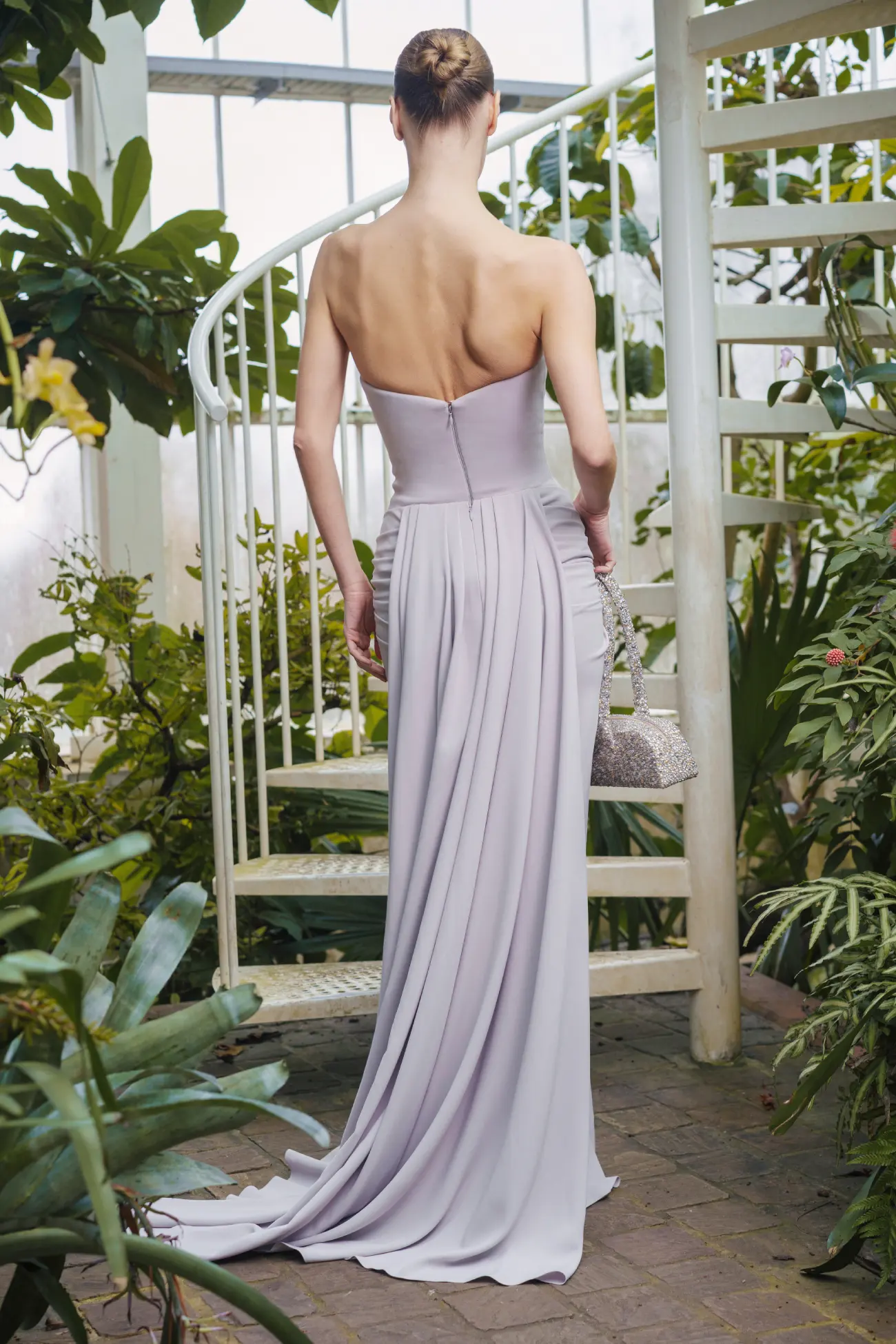 The collection comprises 46 pieces, articulated through elongated and architectural silhouettes that balance structure with fluidity. Sculptural gowns coexist with softer, flowing forms, creating variation in volume and movement across the collection. Variation in embroidery density, material weight, and construction introduces visual rhythm, moving between lighter, more ethereal looks and more grounded, structured pieces. While each look stands independently, together they form a cohesive canvas.