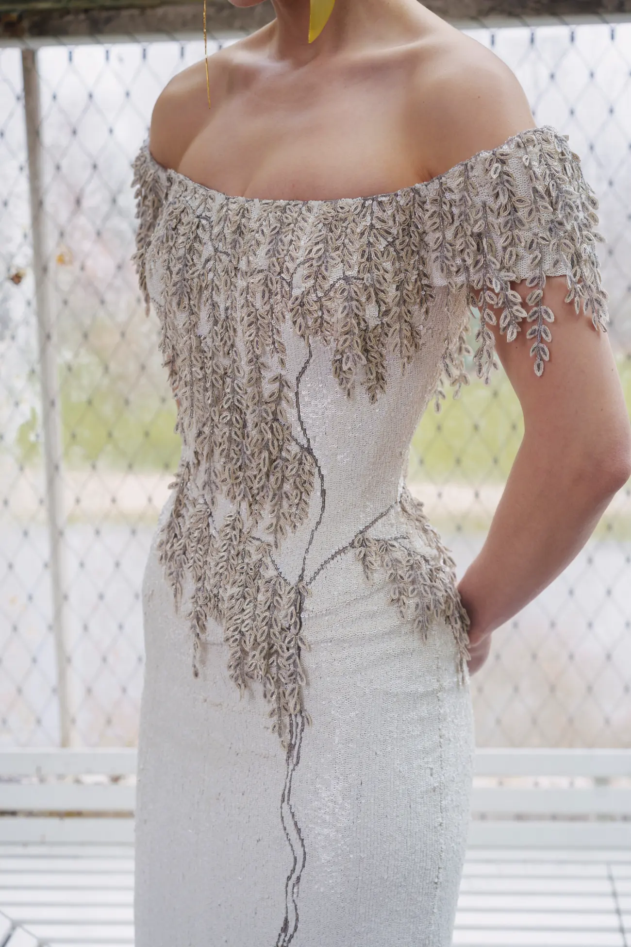 Pearl off the shoulder gown, fully embroidered with sequins and metallic threads, detailed with cascading leaf motifs
