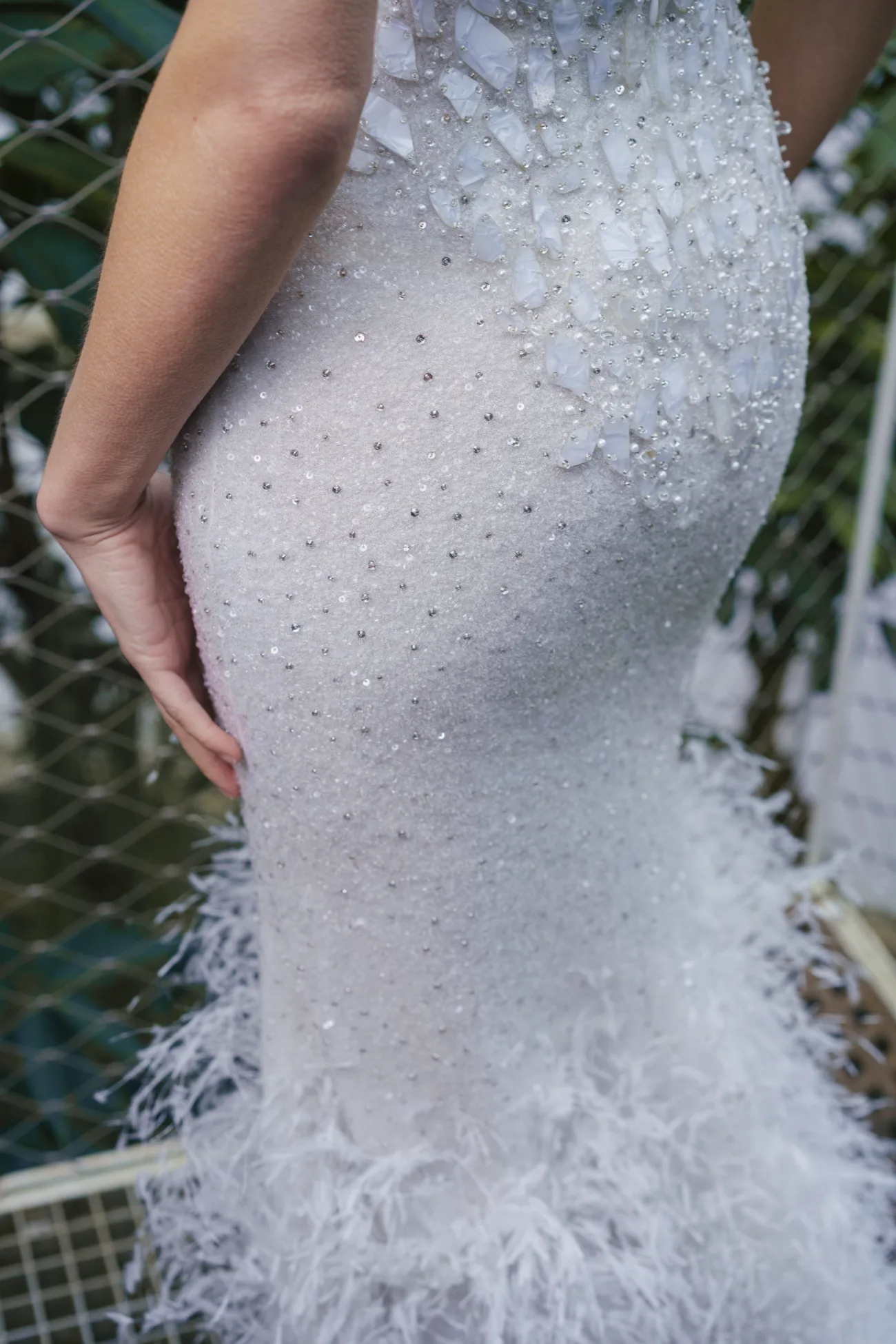 Light sky halter neck gown, embroidered with pearls and sequins, featuring feather accents and a mermaid cut skirt