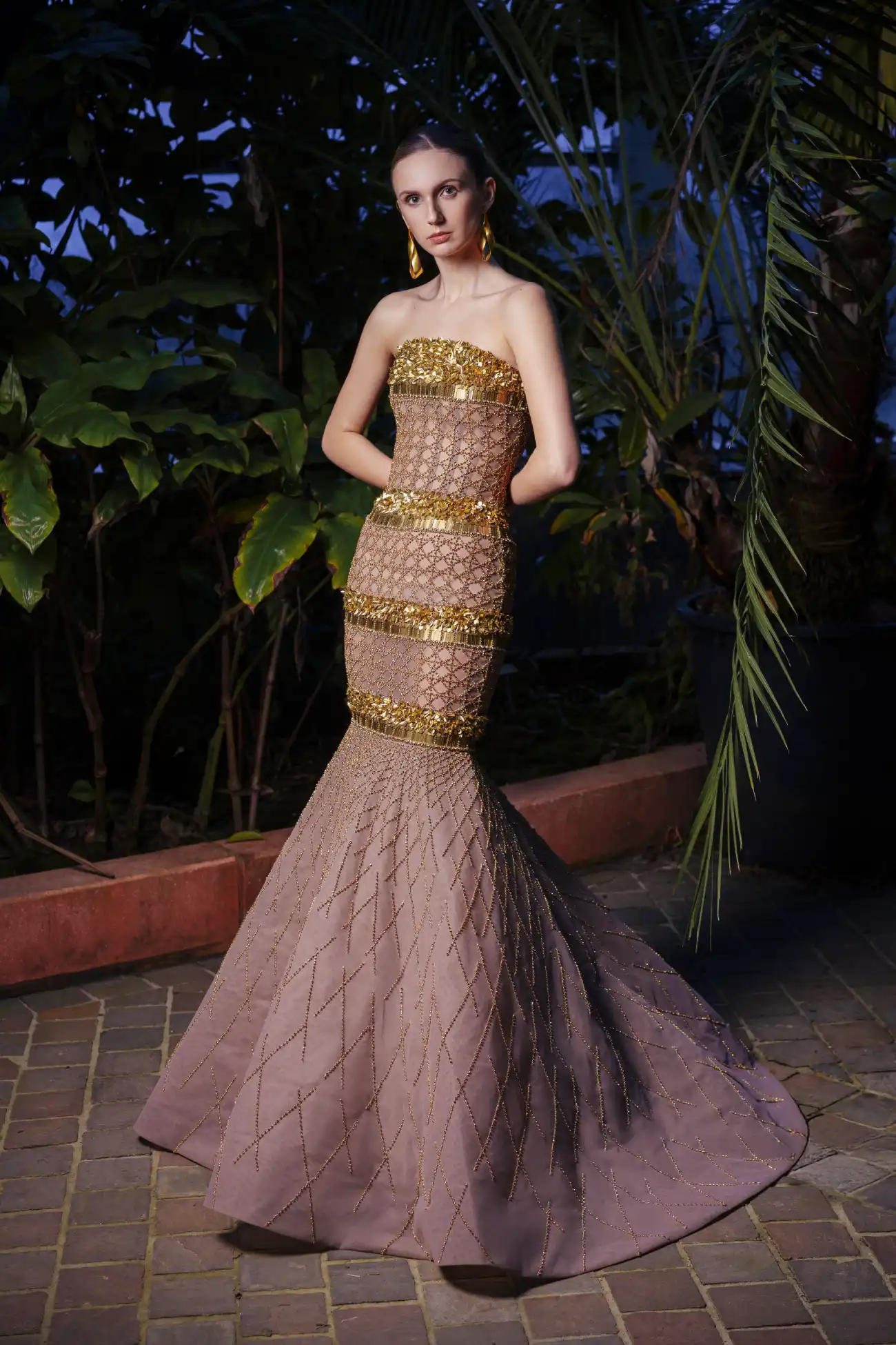 Gold strapless mermaid gown, enhanced with a grid of crystals and sequin panels, finished with delicate floral embellishments