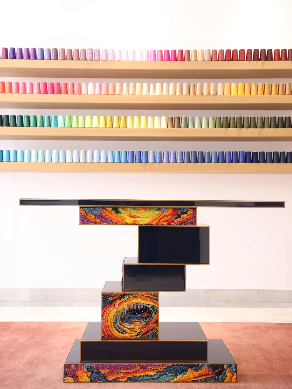 The exhibition showcases 22 works that capture galaxies of color, light, and texture. Each piece is meticulously crafted with techniques drawn from the Maison’s Haute Couture, including Swarovski crystals, French knots, raffia threads, and glass beads.