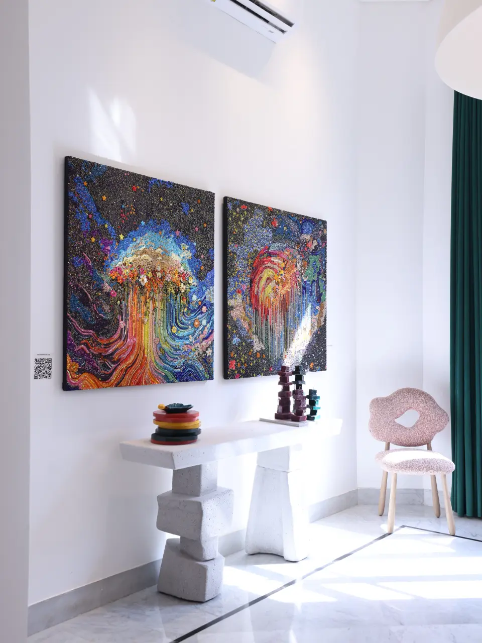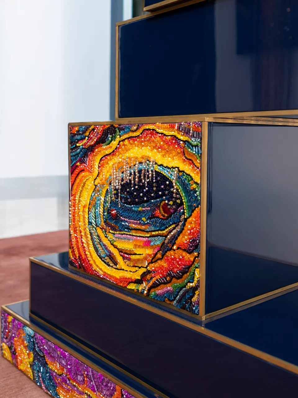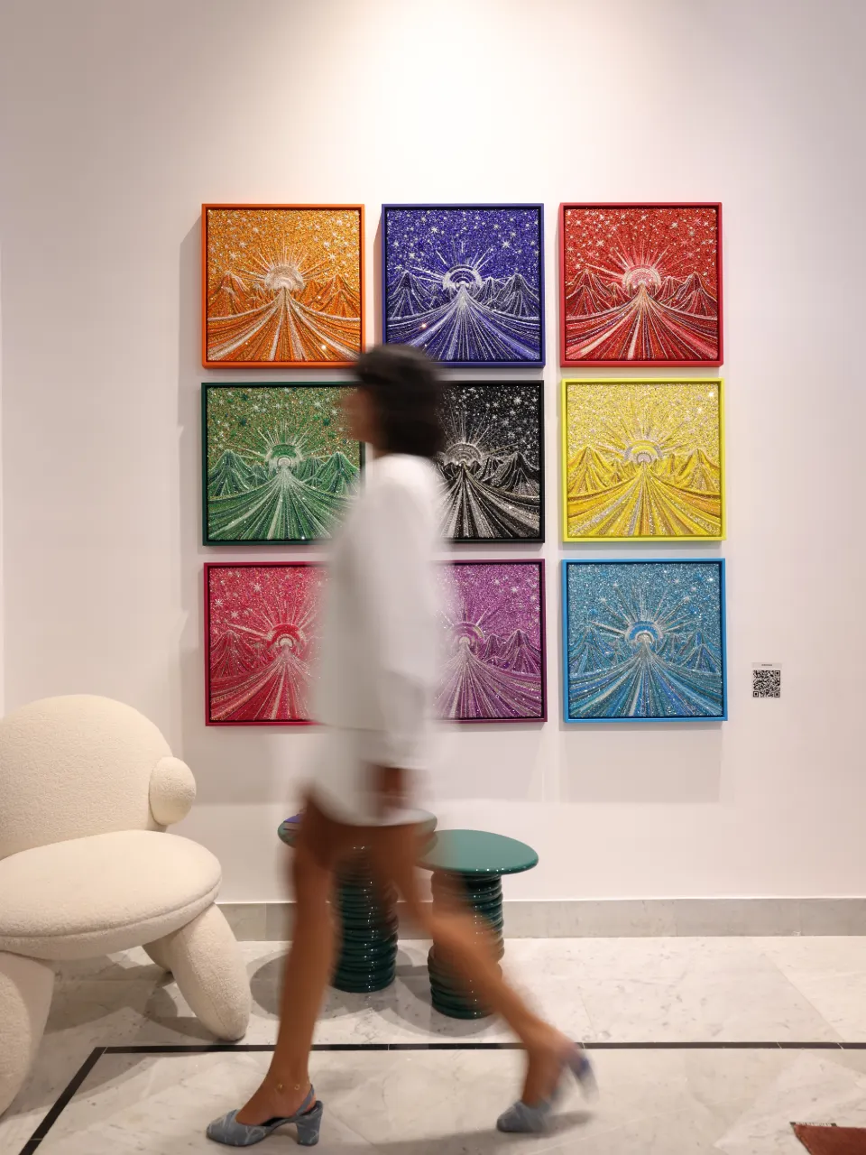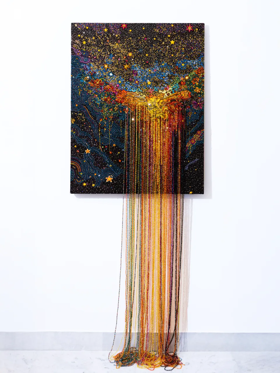 Other notable works include Cosmic Waterfall, where cascading glass beads flow from the canvas onto the floor, blurring the line between artwork and space, and Chromium, a nine-panel constellation of shifting chromatic fields.
